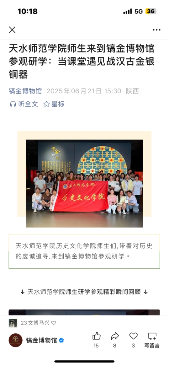 2023级文博班的此次见习,不仅是公司深挖地区资源,理论与实践相结合做好文物与博物馆专业本科生教学工作的生动体现,更是公司校地合作工作的又一次成功尝试。在见习环节设计上,国有博物馆让同学们见证泱泱华夏的优秀传统文化,八路军驻西安办事处的参观让同学们感悟峥嵘岁月的荣光与奋斗,民营博物馆让同学们感悟爱国志士追回海外流失文物的不易。同学们认为,此次见习,从文化视野上、国家历程和个体视角上,多角度激励了同学们以青年人的担当,以文博人的操守,以爱国者的赤诚继续锤炼自身本领,守护历史、传承文明,让古老的文化记忆在新时代绽放更耀眼的光彩。公司也将继续探索多元见习手段,继续为员工提供适应各学习阶段、适合专业特色的公司产品体验。见习过程中,公司师生受到了多家博物馆的热情接待,公司影响力进一步增强,镐金博物馆官微对公司实习活动进行了报道。