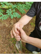 本次练习我们使用的是平头铲。它可用于刮、划、拨、铲、剔、戳、挑、抠、剥等方面。17级文博班学长重点教了20级同学如何使用手铲进行刮面、找面、清面。比如在刮面时,需要将食指放在平头铲凸起部分,将拇指放在铲背面靠近地面部分,使铲面与地面呈45°角,然后一层层刮面。在找面时,则需要使用左手或右手正握,与地面成平行状态,用铲尖刺斜坡下端,若坡面是熟土,则土层会轻易滑落,若是生土,则土层很难掉下来,以便于继续朝里挖15cm到20cm左右,以确定遗址范围。在17级学长讲解示范后,同学们陆续使用手铲进行了清面、刮面、找面练习。学长一一指导,纠正了同学们实际操作中的错误。