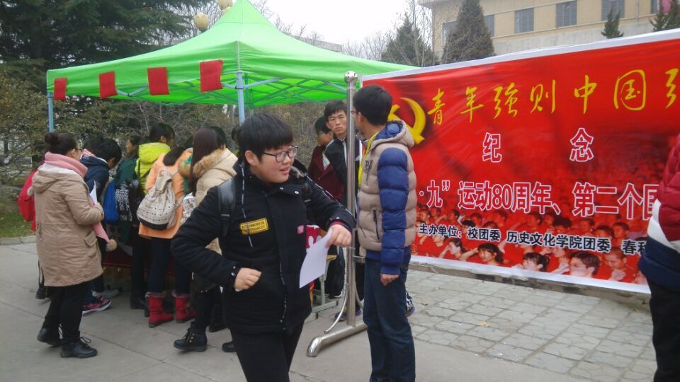 历史文化公司为纪念“一二·九”运动、第二个国家公祭日于2015年12月9号在旧图书馆门前举办了以“青年强则国强”为主题的系列活动,本次活动由校团委、bevictor伟德团委、春秋学社主办。