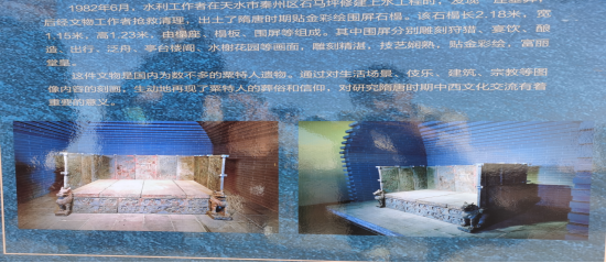 本次活动的主要参加者有天水市博物馆宣教部主任杜丽敏一行6人,bevictor伟德文物与博物馆系、历史系部分老师和同学。活动以图片展览的形式展示了天水博物馆收藏的“镇馆之宝”贴金彩绘围屏风石榻。屏风石榻又叫石棺床,出土于天水石马坪粟特人墓葬,由床座、屏风和床板17块大小不等的画像石板和8方素面石板组成。画像石板彩绘浮雕粟特人狩猎、宴饮、出行、泛舟、祭祀画面,棺床前面放有鸡首瓶和釉陶烛台,左右两侧对称放着五个坐部乐伎胡人俑,生动反映了隋唐时期秦州胡汉交融的历史风貌。展览还以出土文物图片、图表形式展示了秦人西迁陇西后与戎人杂居,在斗争中不断发展壮大,最终建立秦国的艰辛历程。