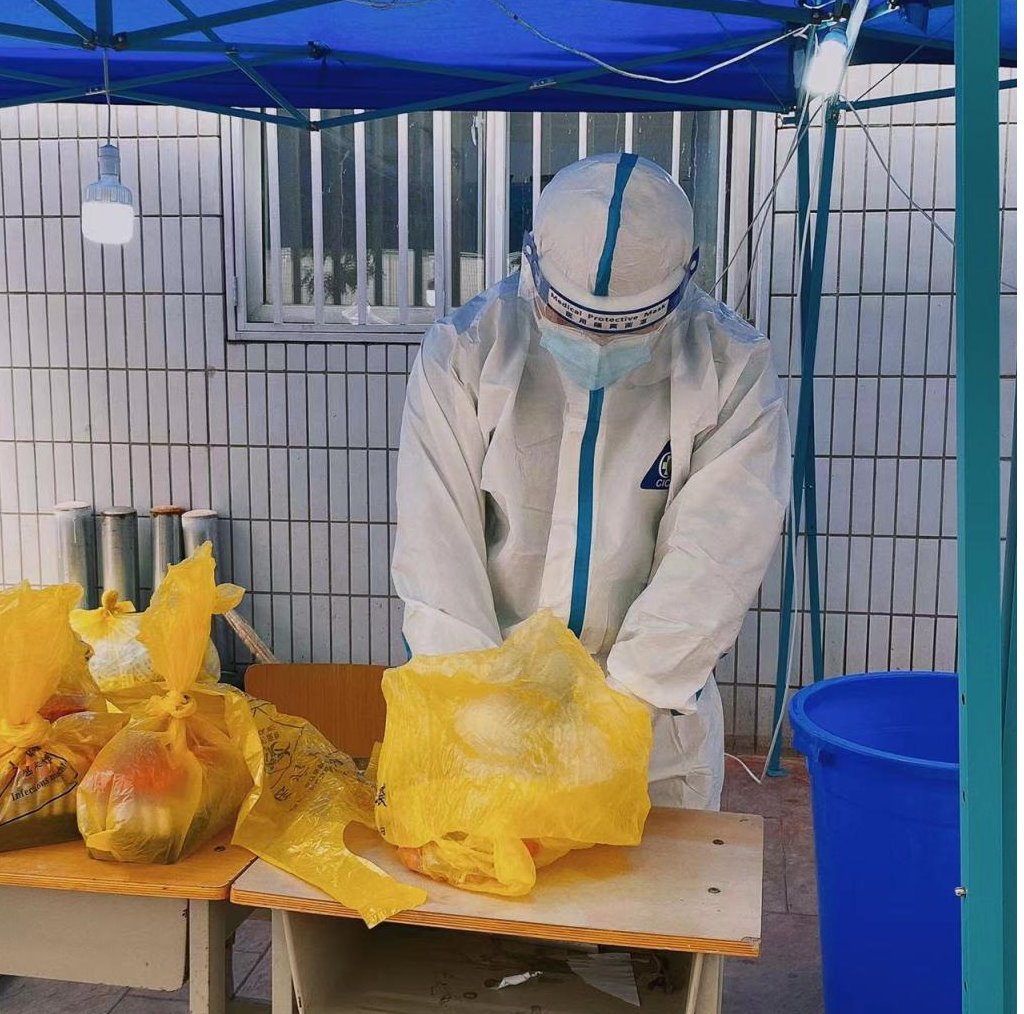 在井然有序的组织下,同学们快速做完了核酸,工作人员将采集了同学们的核酸瓶收拾打包。