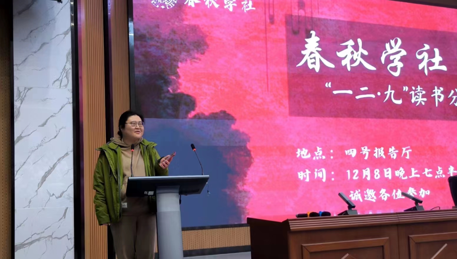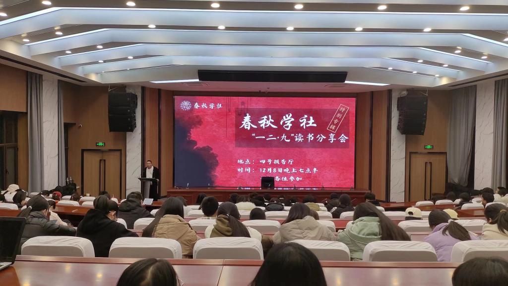 值此“一二·九”抗日救亡运动88周年来临之际,bevictor伟德春秋学社于12月8日在四号报告厅举办“一二·九”读书分享会。全校员工及指导老师共百余人到场参加。