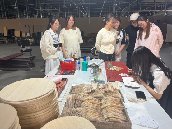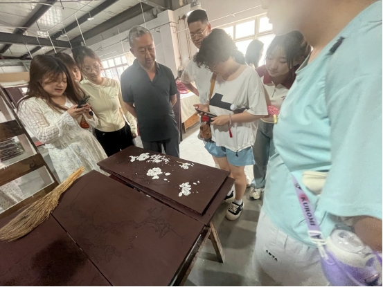 在二楼生产车间,两位老师为同学们讲解了制胎、制漆、刻石、镶嵌、描金等生产工序,重点介绍了平磨螺钿、堆塑彩绘、堆塑贴金、脱胎等天水地区雕漆特色技艺。同学们看到了华彩背后的时间沉淀,感受到了技艺传承者十年如一日的坚持。在厂方老师协助下,同学们亲手体验了雕漆制作中“贴蛋壳”这一工序。