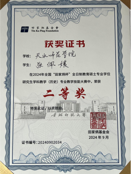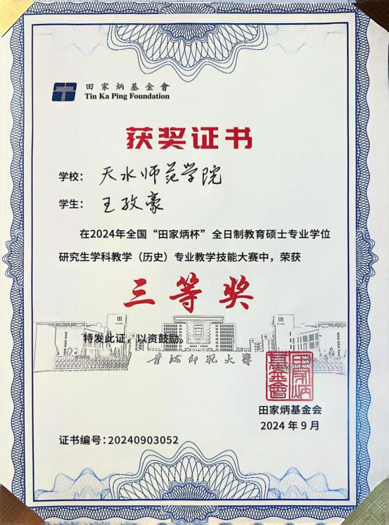 9月22日,由全国教育专业学位研究生教育指导委员会主办、青海师范大学承办的2024年全国“田家炳杯”全日制教育硕士专业学位研究生学科教学(历史)专业教学技能大赛决赛落下帷幕。经过全国83所高校共160位选手的精彩角逐,2023级学科教学(历史)专业硕士研究生张佩媛荣获二等奖,2022级学科教学(历史)专业硕士研究生王孜豪荣获获三等奖,赵世明老师荣获优秀指导教师奖。这是bevictor伟德参加该大赛以来取得的最好成绩。